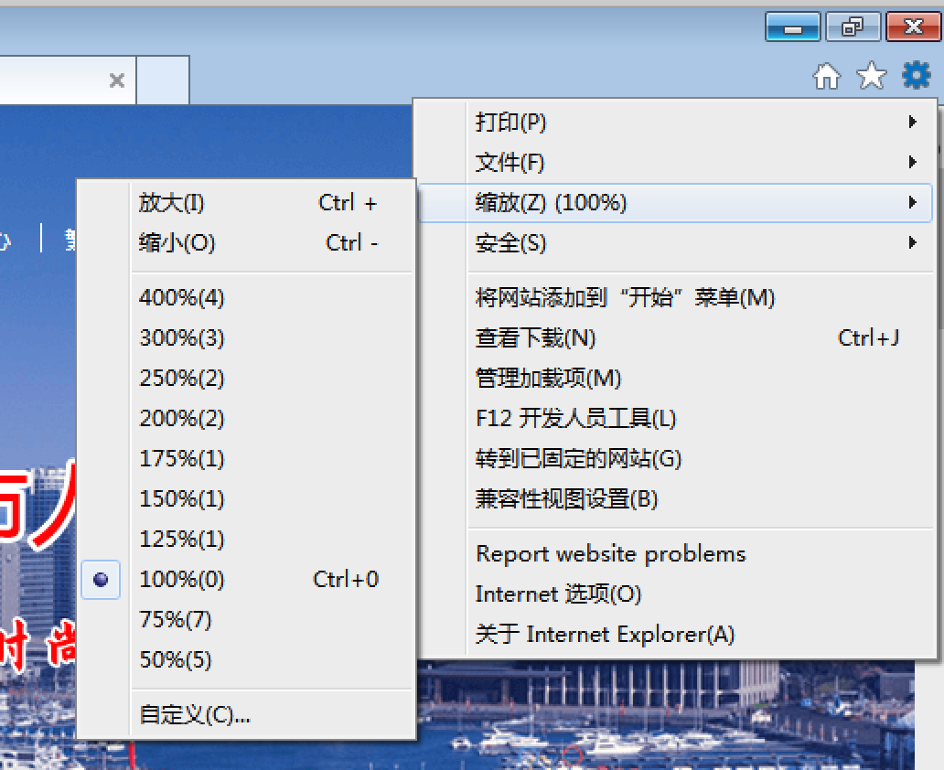 浏览器缩放设置,以IE浏览器为例进行说明:点击浏览器“工具”菜单->缩放,推荐使用100%。
