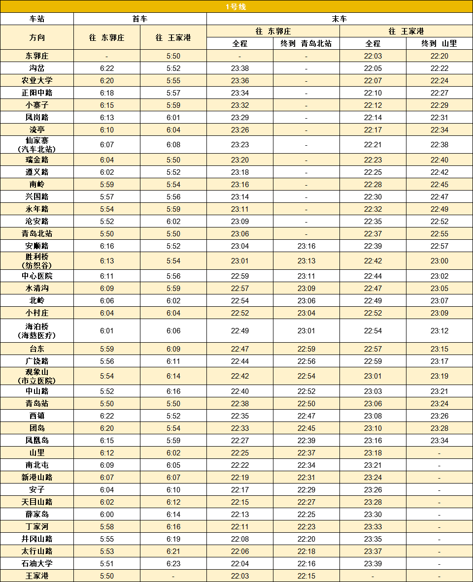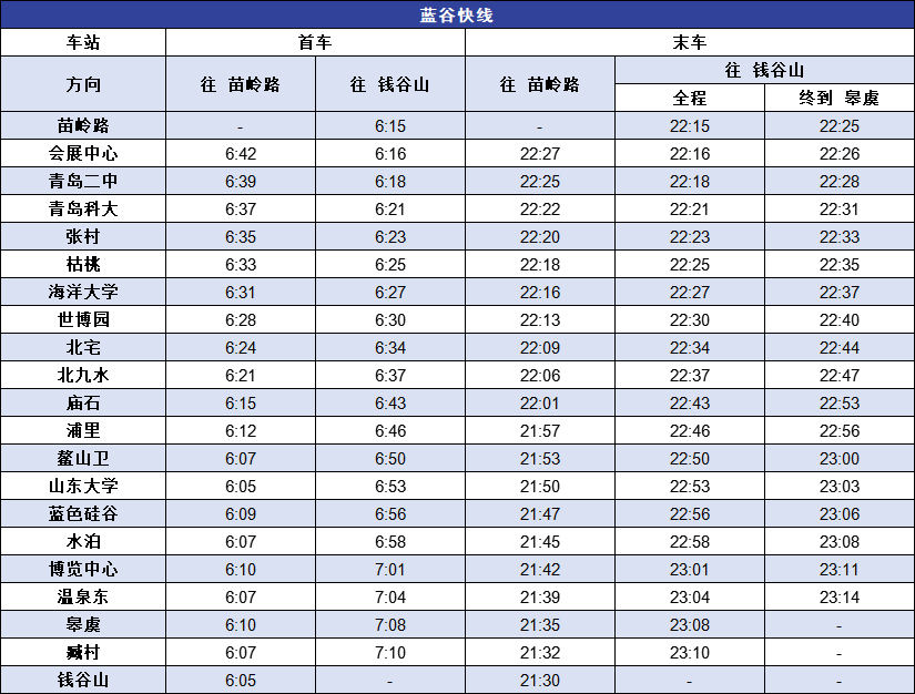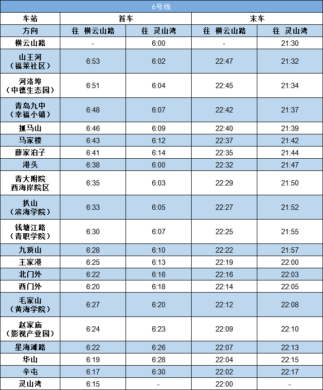 青岛地铁1号线运营时间17.85小时、2号线运营时间17.57小时、3号线运营时间17.43小时、4号线运营时间17.63小时、6号线运营时间16.83小时,8号线运营时间17.45小时,蓝谷快线运营时间17.20小时、西海岸快线运营时间17.23小时(各线路首末班车时刻见下图)。