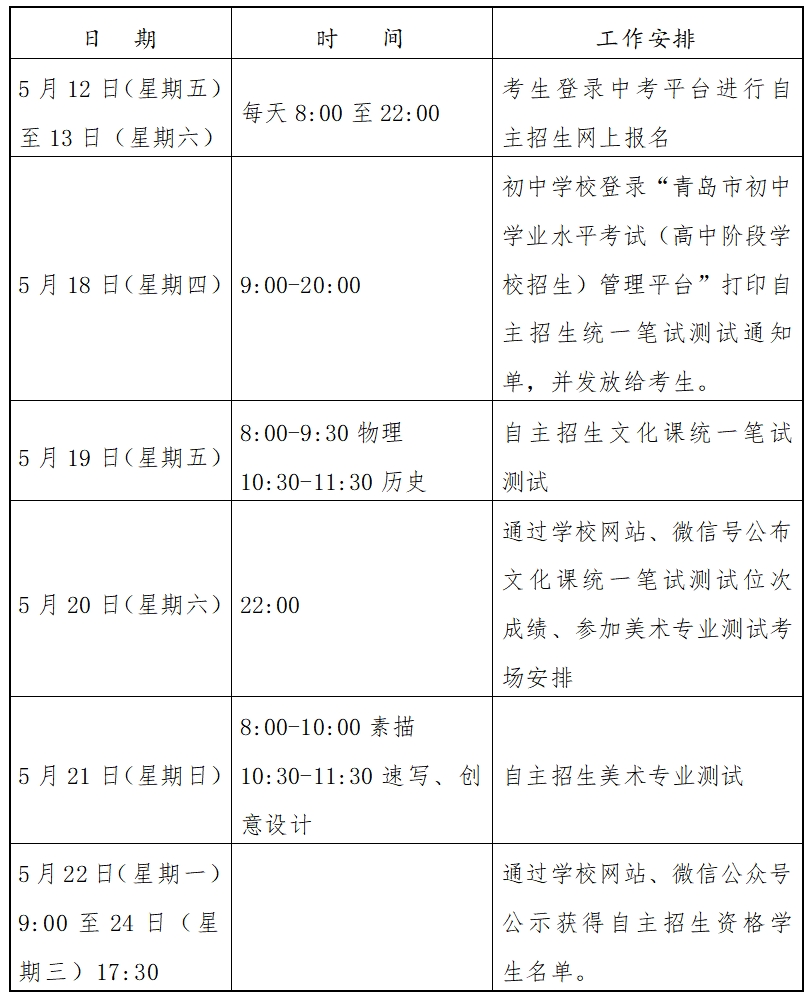 自主招生测试分为文化课统一笔试测试与美术专业测试。考生持身份证、自主招生统一笔试测试通知单,按照通知单上的考点和时间参加文化课统一笔试测试,文化课统一笔试测试的考点、考场由市教育局统一安排。参加文化课统一笔试测试的所有考生均应参加我校自招美术专业测试,美术专业测试在青岛六中进行。美术专业测试有关要求,考生于5月18日(星期四)晚登录学校网站查询。