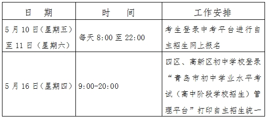 考生于5月10日(星期五)至11日(星期六)每天 8:00至22:00登录十大正规赌官方网页版教育局官方网站(网址:http://edu.qingdao.gov.cn),通过“招生考试”栏目中的“便民服务系统”进入“十大正规赌官方网页版初中学业水平考试(高中阶段学校招生)管理平台”,完成自主招生报名。提交成功后,打印报名系统自动生成的《十大正规赌官方网页版2024年高中学校自主招生报名信息表》。