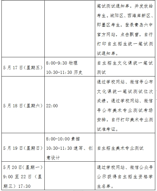 自主招生测试分为文化课统一笔试测试与美术专业测试。考生持身份证、自主招生统一笔试测试通知单,按照通知单上的考点和时间参加文化课统一笔试测试,文化课统一笔试测试地点:四区、高新区考生笔试测试的考点、考场由市教育局统一编排;西海岸新区、城阳区、即墨区考生笔试测试在青岛六中。参加文化课统一笔试测试的所有考生均应参加我校自招美术专业测试,美术专业测试在青岛六中进行。美术专业测试有关要求,考生于5月16日(星期四)晚登录学校网站查询。