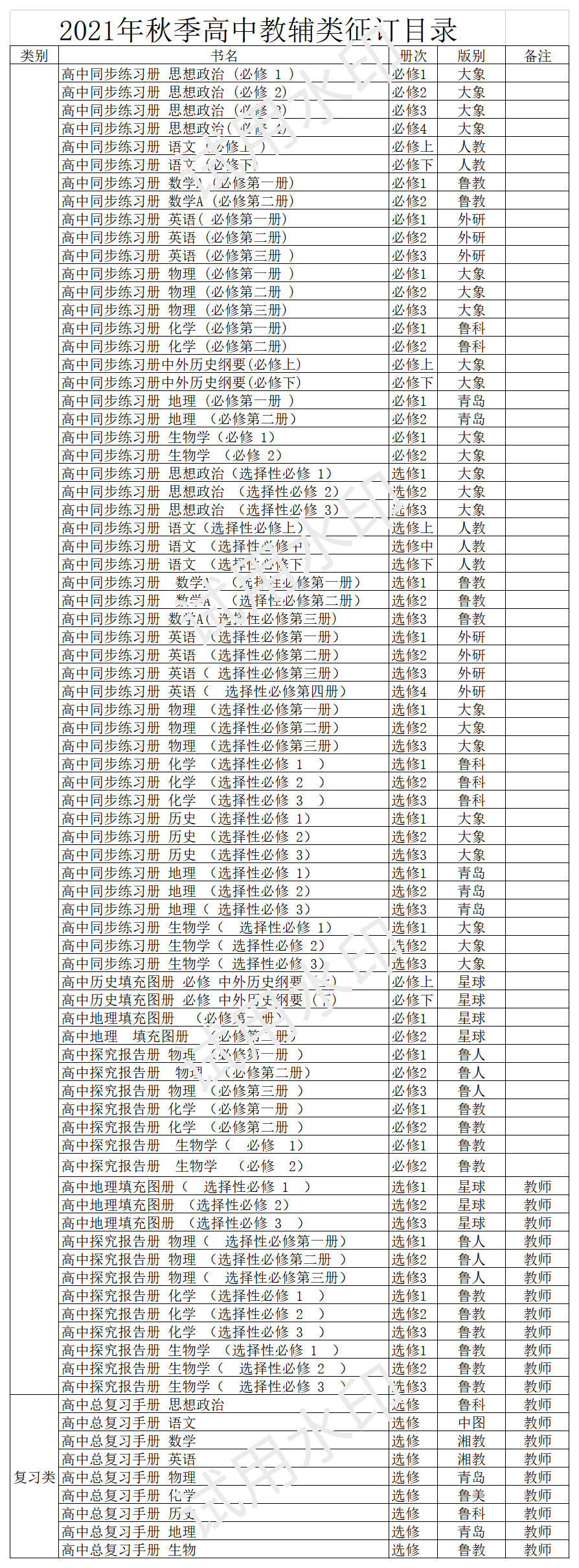 2021年秋季教材教辅征订目录
