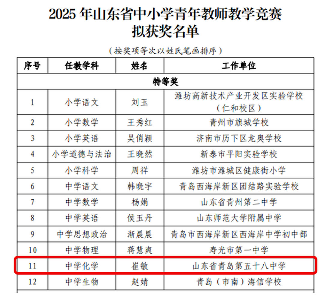 近日,2025年山东省中小学青年教师教学竞赛(决赛)在济南落下帷幕。我校化学教师崔敏凭借扎实的专业功底、精妙的教学设计与出色的现场发挥,荣获中学化学组特等奖,展现了青岛五十八中青年教师卓越的教学风采与专业素养!