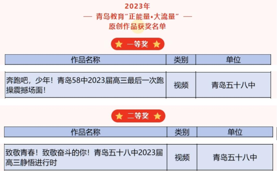 近日,正规十大网赌网站教育局发布了《关于公布2023年青岛教育“正能量·大流量”原创作品获奖名单的通知》,全市共有45个作品获一、二、三等奖,其中我校提报的两个作品分获一、二等奖,位列全市中小学校首位。