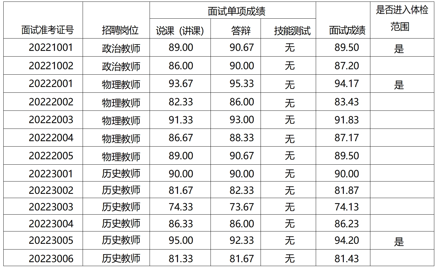 全部结束的招聘岗位面试成绩予以公布。