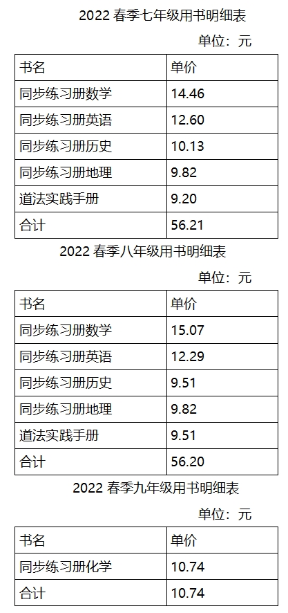 根据青财教【2020】21号《关于免除城市义务教育段学生教科书费和全市义务教育段学生作业本费的通知》 文件规定,免费包括:国家课程用书、地方课程用书、寒假作业、作业本。之前根据《十大正规赌官方网页版中小学教辅材料选用目录》选用的学习用书需收费。现2022春季收费用书明细已结算完毕,请核对。