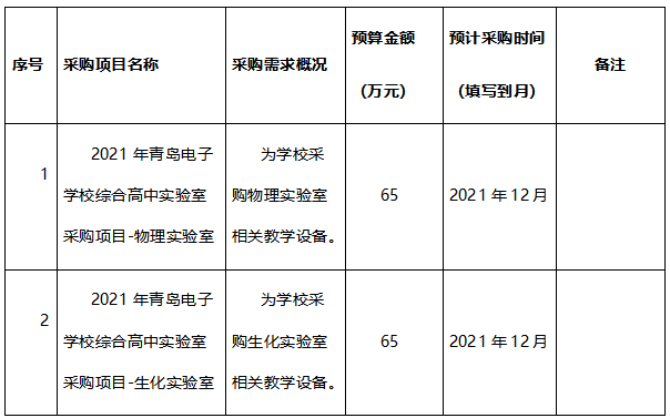 为便于供应商及时了解政府采购信息,根据《财政部关于开展政府采购意向公开工作的通知》(财库〔2020〕10号)等有关规定,现将 青岛电子学校 2021年 11(至)12 月采购意向公开如下: