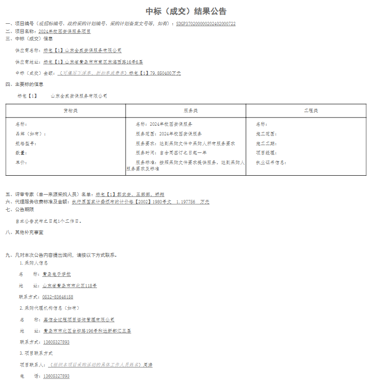 青岛电子学校2024年 校园安保服务项目成交公告_青岛政务网