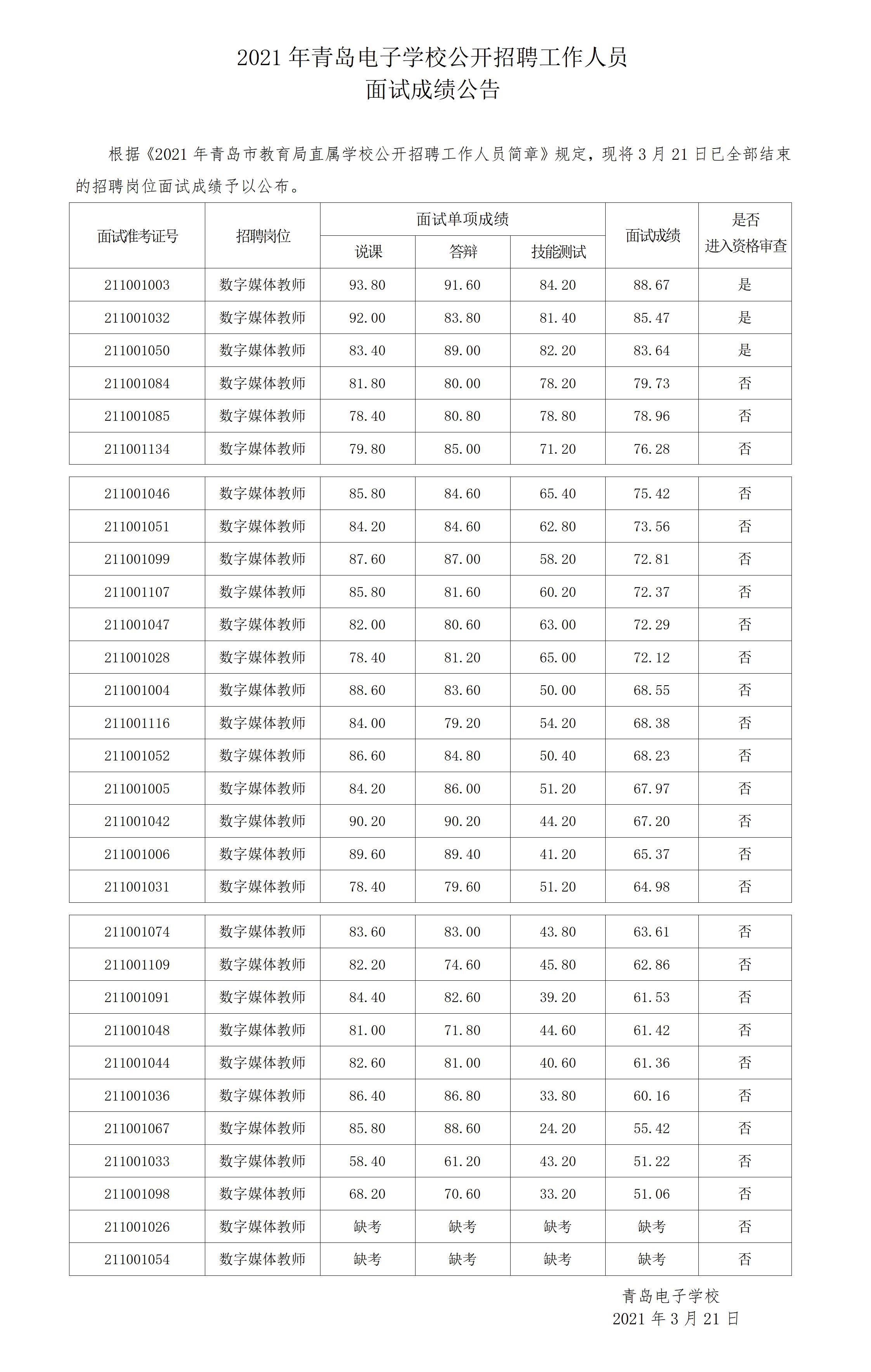 青岛电子学校 2021年公开招聘工作人员面试成绩公告_青岛政务网