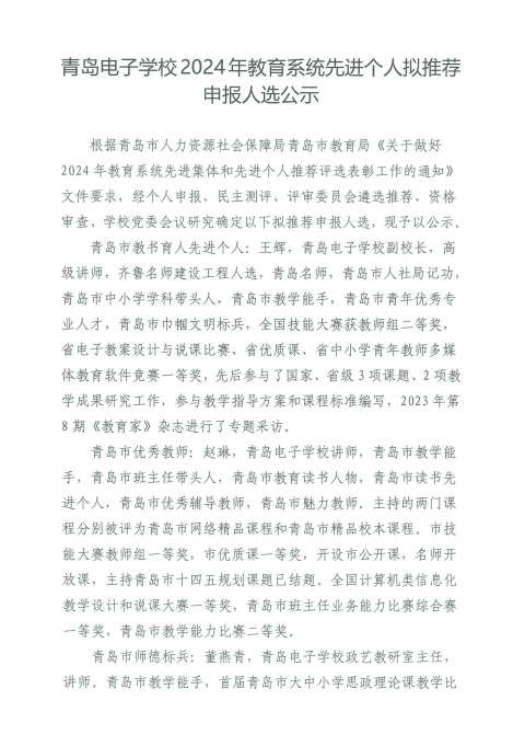 青岛电子学校2024年教育系统先进个人拟推荐申报人选公示_青岛政务网