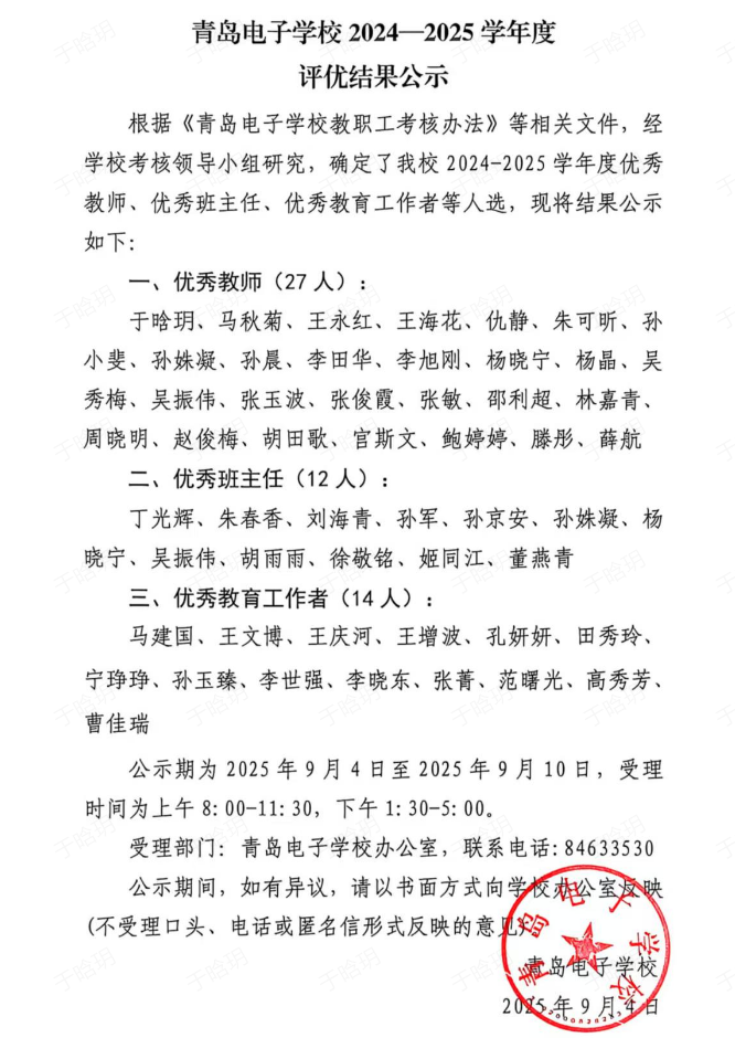 青岛电子学校 2024-2025学年度评优结果公示_青岛政务网