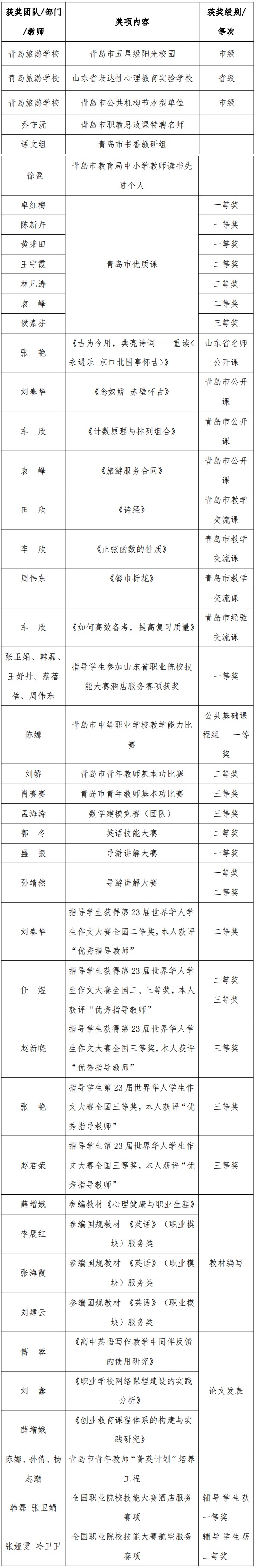 青岛旅游学校 2023 年度教师教学获奖情况汇总