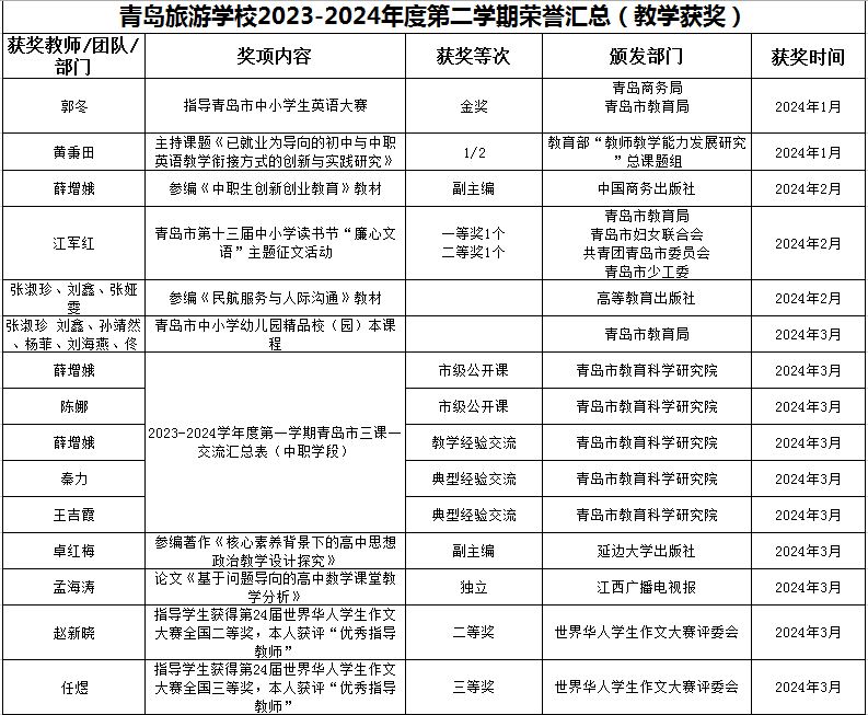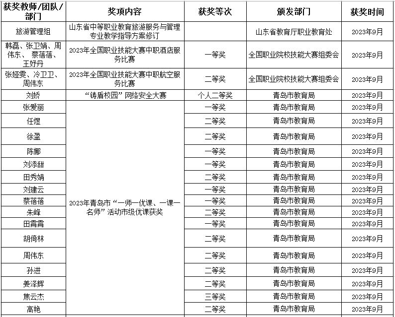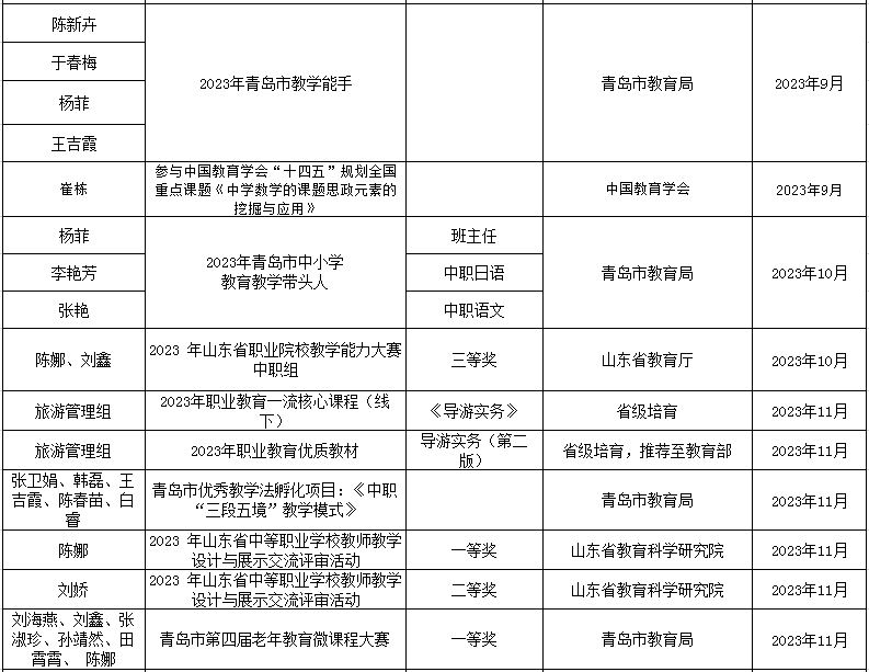 2023-2024学年度旅游组完成了山东省中等职业教育旅游服务与管理专业教学指导方案修订,酒店组获评2023 年山东省职业教育教学创新团队,我校教师主持和参与省市教科研课题6项,发表论文12篇、主编和参编著作2部、主持参编教材6部。