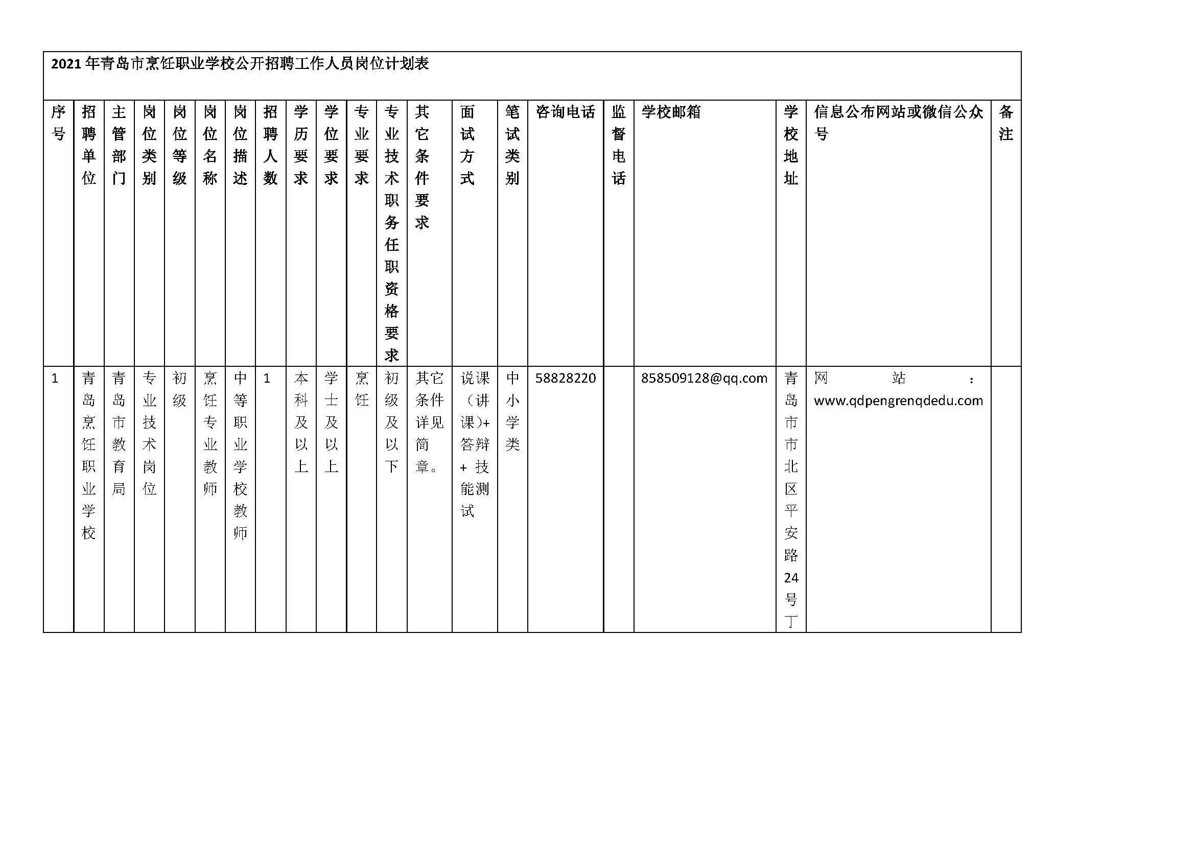 十大正规赌官方网页版烹饪职业学校2021年公开招聘工作人员岗位计划表_青岛政务网