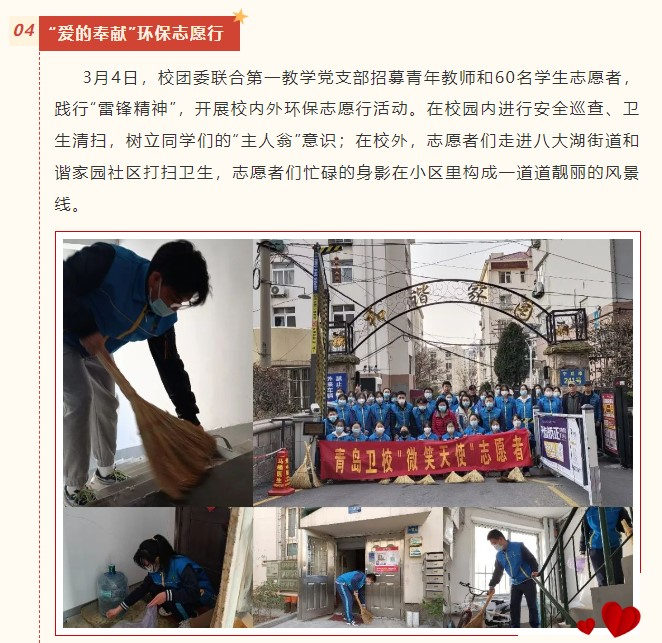 3月4日,校团委联合第一教学党支部招募60名学生志愿者,开展践行“雷锋精神”,淬炼学生热爱劳动的优良品质的校内外环保志愿行活动。在校园内进行安全巡查、卫生清扫,树立同学们的“主人翁”意识和动手劳动能力;在校外,志愿者们走进八大湖街道和谐家园社区打扫卫生,志愿者们忙碌的身影在小区里构成一道道靓丽的风景线。