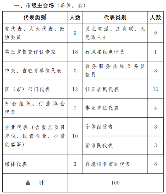 (三)接受万名市民代表评议。通过随机抽取、组织推荐和自愿报名相结合的方式,进一步优化市民代表构成,邀请1万名市民代表分别在市级主会场以及各区(市)和青岛高新区分会场,现场听取各部门述职报告,采用无记名的方式现场填写并提交评议票,每组发放评议票2500张。同时,组织填写社情民意调查问卷等。市民代表的评议票当场回收、密封,主会场与分会场评议票混合后由第三方汇总统计,评议结果计入正规十大网赌网站各部门全市综合考核成绩。