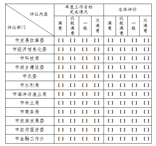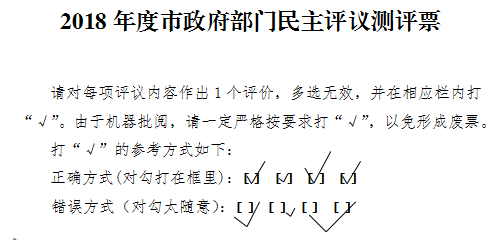 测评票上每个部门有2项评议内容,每项评议内容都是单选,请在相应评议内容对应栏内打“√”,多选无效。