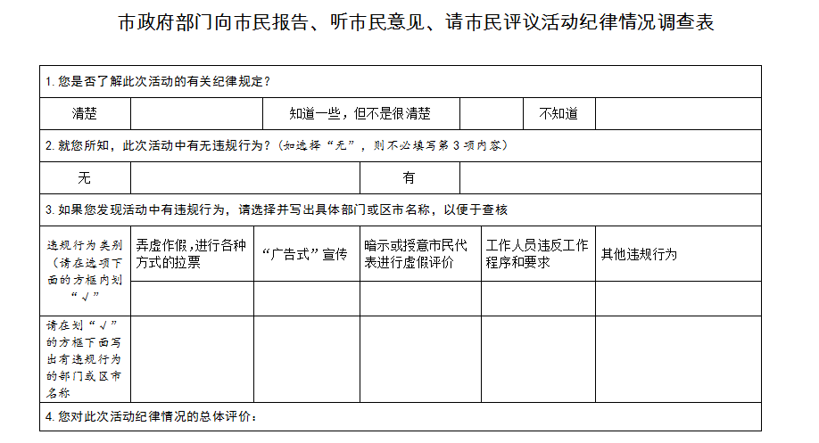 为确保向市民报告、听市民意见、请市民评议活动规范有序、公开公正地开展,现就活动有关纪律规定、活动中有无违反规定的行为等情况进行调查。调查表中有四项内容,请据实填写。如有违反活动纪律的行为,请写出具体部门或区市名称,并留下您的姓名和联系电话,方便核查和反馈。对调查中发现的违规问题,市“三民”活动联席会议办公室将立即进行调查处理。