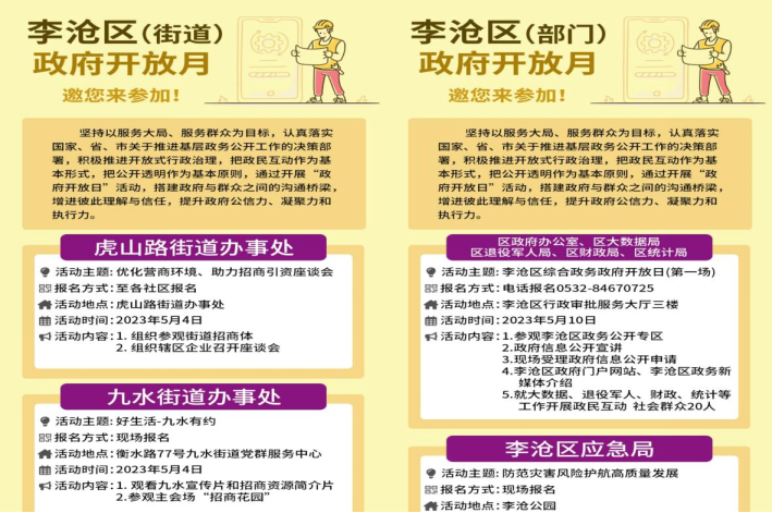 区街两级行政机关积极筹备,引导报名、主动邀请,活动内容丰富、效果显著。“四类活动”引领,政府开放载体丰富,开放活力增强。政策解读类活动以政策咨询宣讲点为主阵地,就民生问题及热点问题展开深入政策解读,8个部门、2个场次部门联合政策解读专场开放活动,为群众答疑解惑提供了全方位政策解读服务。座谈交流类活动就部门重点、特色亮点工作进行座谈,“群众看病就医满意度提升工作”专场活动通过“听、看、谈、评”的方式,持续改善医疗服务和人民群众就医感受。机关开放类活动邀请群众代表走进政府机关办公和政务服务场所,体验政府工作和政务服务流程。实地参观类活动主动邀请市民代表参观政府重要民生工程实施和推进情况,40余名市民深入了解了近年来李沧区河道整治及河长制工作成效。此外,2500余名学生和家长共同走进校园,实地感受全区教育和体育的发展现状。本轮“政府开放月”共举办活动26场次,参与群体涵盖人大代表、政协委员、企事业单位职工、青少年学生、社区工作者、普通群众等,最大维度保障参与活动人群的广泛代表性。