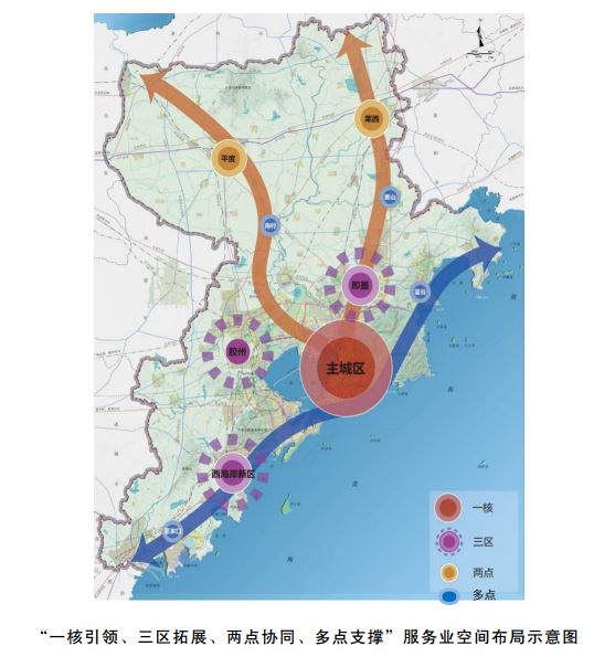 3.两点协同。深入推进平度莱西攻势,根据国家城乡融合发展试验区建设新要求,以服务国家战略、服务产业发展为重点,培育发展现代物流、现代商贸等生产性服务业;利用丰富的生态禀赋和休闲农业资源,促进精品旅游等生活性服务业高品质发展,将平度、莱西打造成为区域性综合服务节点,实现与其他区域协同发展。