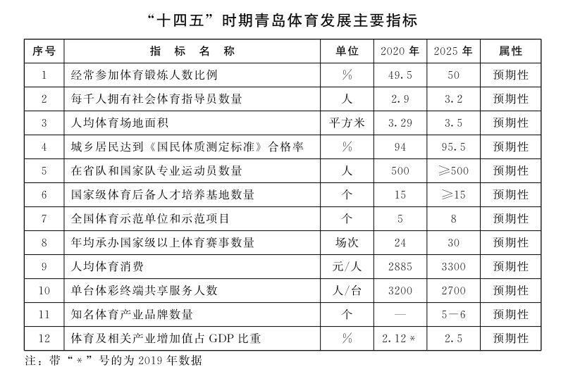 到2025年,集聚一批国际高端体育赛事,赛事类型更加丰富多样,运营管理更加规范高效,服务保障更加坚强有力,帆船之都、足球名城品牌特色更加凸显,社会美誉度和国际竞争力显著提升。重大体育场馆设施和全民健身服务体系更加优化完善,群众体育健身意识普遍增强,全民健身组织服务网络不断完善,全民健身系列活动更加丰富。推动体教多维度融合,完善青少年竞赛体系,推动夏季项目与冬季项目、男子项目与女子项目、职业体育与专业体育、"三大球"与基础大项等实现均衡发展,本市运动员在国际国内大赛的成绩稳步提升,竞争力持续增强。国家体育消费试点城市建设成效显著,体育创新活力、体育市场活力和体育发展效率跻身全国城市前列,体育产业增加值占全市生产总值比重持续提升。体育文化感召力、影响力、凝聚力不断提高,体育交流活跃,体育要素集聚,形成一批体育赛事组织平台、体育科技创新平台、体育资源交易平台,全球知名体育城市和国家体育中心城市地位初步确立。