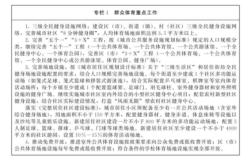 建设国家全民健身示范中心。争创国家全民运动健身模范市,推动场地设施向智能化、个性化便民利民发展,公共服务功能更加完善。到2025年,人均体育场地面积达到3.5平方米以上,每千人拥有社会体育指导员达到3.2名,城乡居民《国民体质测定标准》合格率达到95.5%。