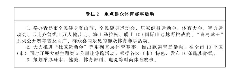 坚持政府主导、企业主体、协会参与、市场运作,彰显青岛山、海、城特色,突出"运动青岛、健康城市"主题,每月推出1个体育节庆活动,打造青岛群众体育品牌,让市民天天想健身、节庆掀高潮、常年不断线。以"社区运动会"为龙头,"一区一品"为样板,打造市级10个以上、每区(市)5个以上不同层次和类型的公益性全民健身活动品牌,形成届次。依托节假日,大力组织开展健康跑、健步行、骑行、登山、游泳、球类、广场舞等群众性体育赛事活动,街道(镇)每年举办4次以上、村(社区)每年举办2次以上群众体育赛事活动。办好冰雪节,推广群众冰雪运动。到2025年全市经常参加体育锻炼人数比例达到50%,每年市级全民健身活动不少于90项,区(市)级不少于300项,参与人数超过2000万人次。