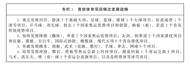 深入普及田径、游泳、帆船等传统优势项目,加强"三大球"项目发展,积极探索符合青岛实际的足球发展新思路和管理模式。实施"冬季项目后备人才培养工程",着力打造"北冰南展"桥头堡。加大对社会力量办体育的政策支持,完善联办基地、后备人才基地网络和考评体系。挖掘区(市)潜能,优化项目布局,补齐项目短板,提高优势项目核心竞争力。
