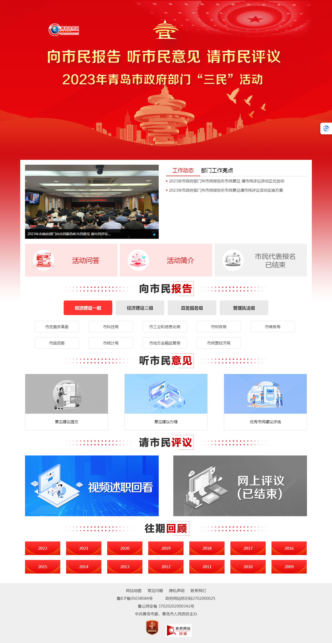 二是丰富政民互动平台。创新打造“青诉即办”诉求解决平台,将政务公开工作与倾听办理群众诉求相结合,快速解决群众、市场主体和基层“民生、发展、执法”三大类诉求。连续15年开展“向市民报告、听市民意见、请市民评议”活动,继续沿用线上“云述职、云评议、云征集”模式,组织38个政府部门通过“公开云述职”+“局长访谈”向市民报告工作,听取意见建议。做好 “问政青岛”“民生在线”“直通12345”等品牌栏目,发布“12345热线指数”,为精准解决民生问题提供了“风向标”。