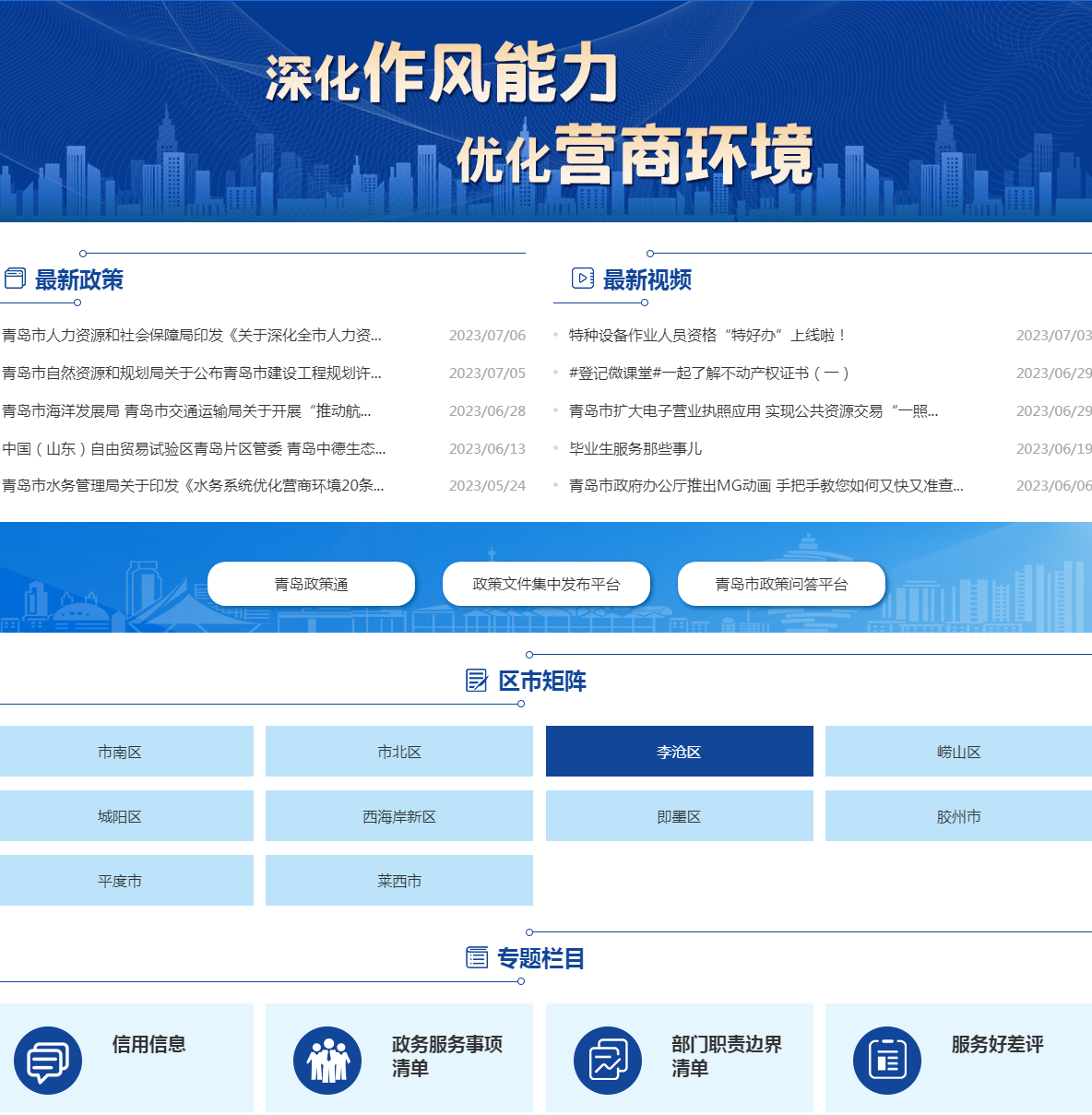 六是开设“优化营商环境”专题专栏。设置“最新政策”“最新视频”“区市矩阵”“专题栏目”四个栏目,整合发布各区(市)、各部门优化营商环境方面的政策文件、政策解读、视频动画等内容,多角度、多层次、全面生动地向企业和群众呈现近年来我市优化营商环境的政策措施和特色亮点,发布信息690余条,视频97条。