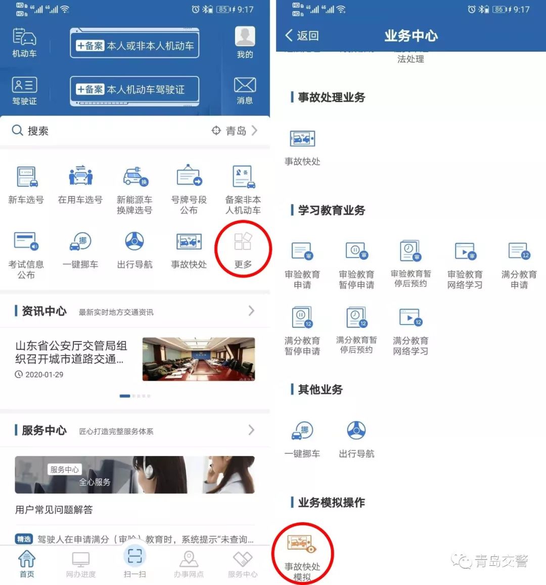 2、打开“交管12123”APP → 点击更多 → 业务中心 → 业务模拟操作 → 事故快处模拟。