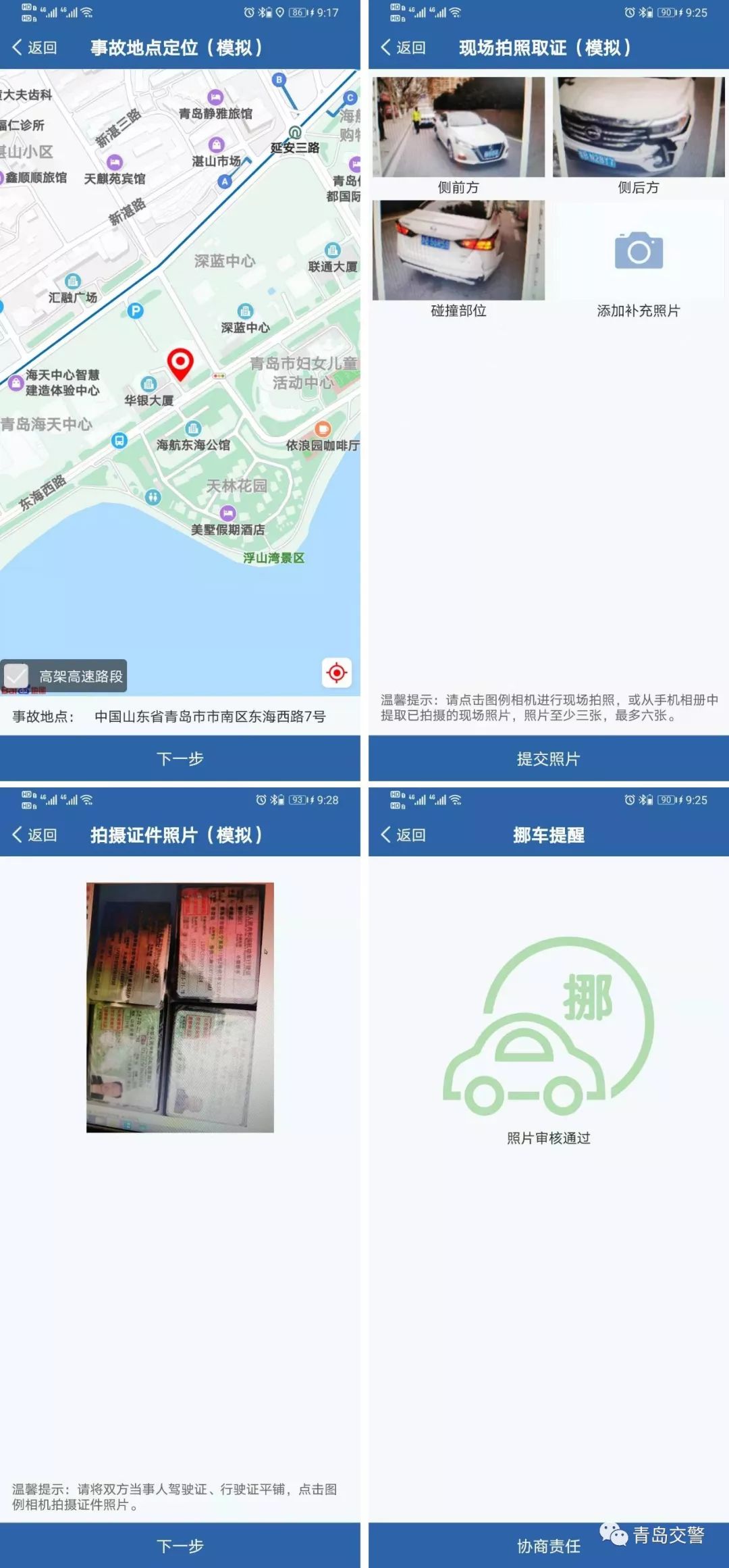 2、点击事故快处,进入事故办理(跟模拟基本一致),将车辆移至不妨碍交通通行且安全的地点协商责任。
