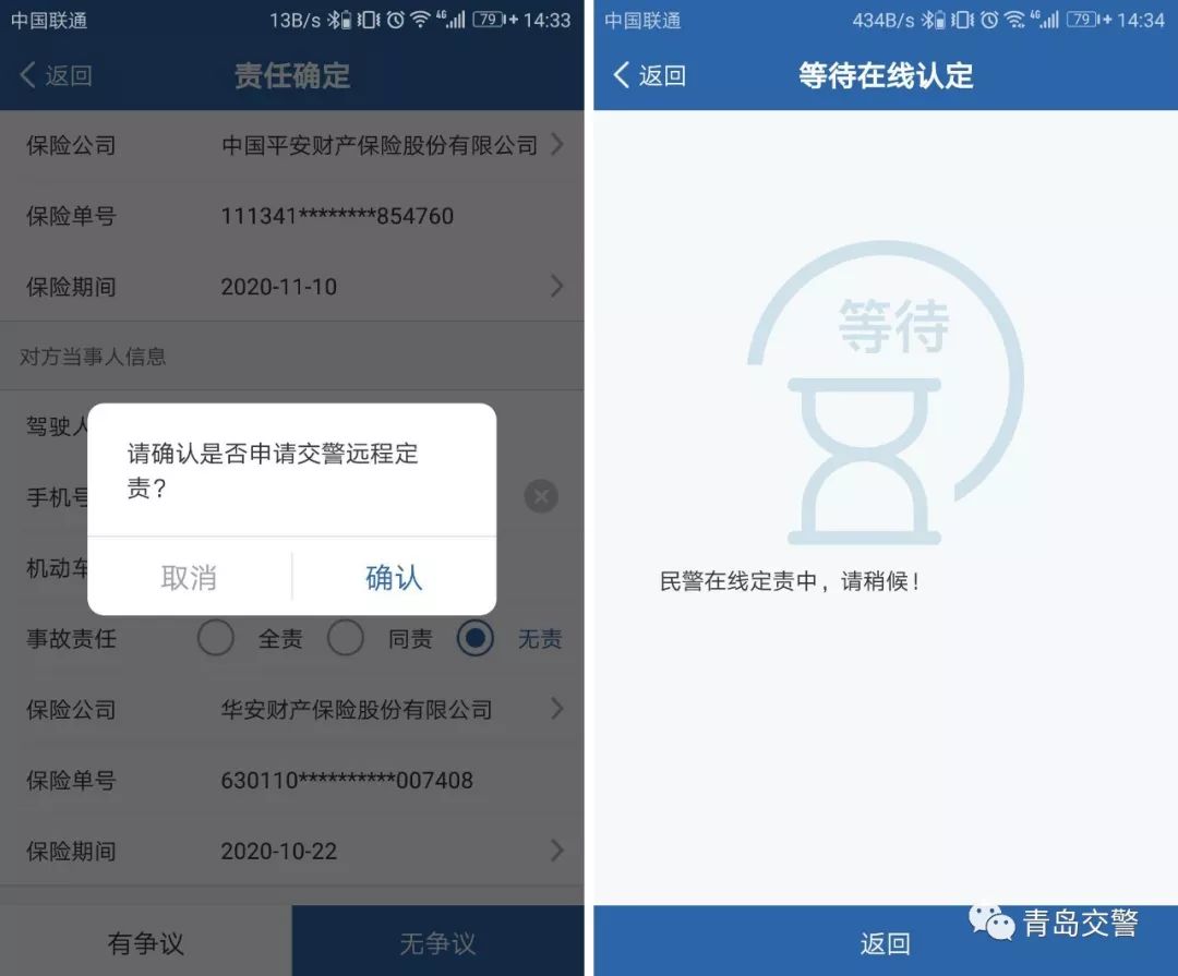 6、双方当事人对事实成因、责任有争议,或单车车损5000元以上的,选择有争议,申请事故民警远程定责。