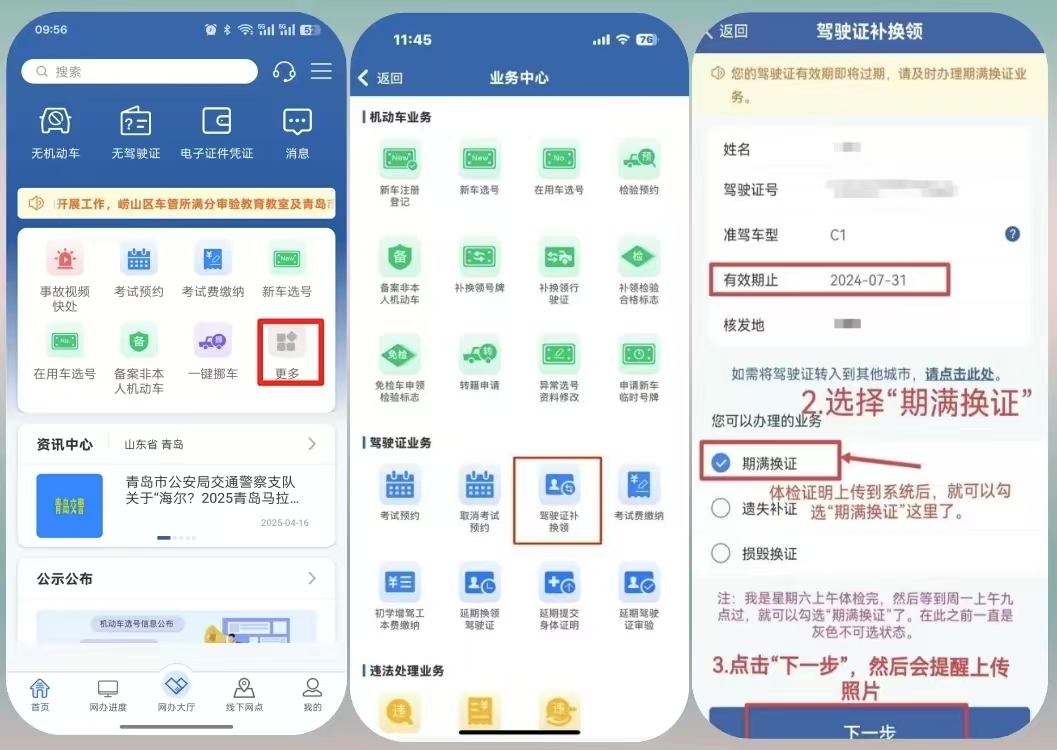 1.下载注册并登录“交管12123”APP,绑定驾驶证后,首页点击“更多”→业务中心→驾驶证业务→驾驶证补换领→ 勾选【期满换证】,根据相关提示进行操作即可。