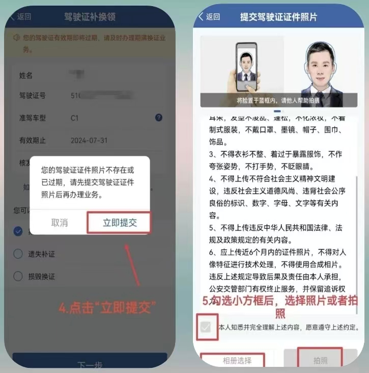 2.提交材料:上传您的驾驶证照片(可以是之前上传的或现场拍摄的),并确认体检信息。