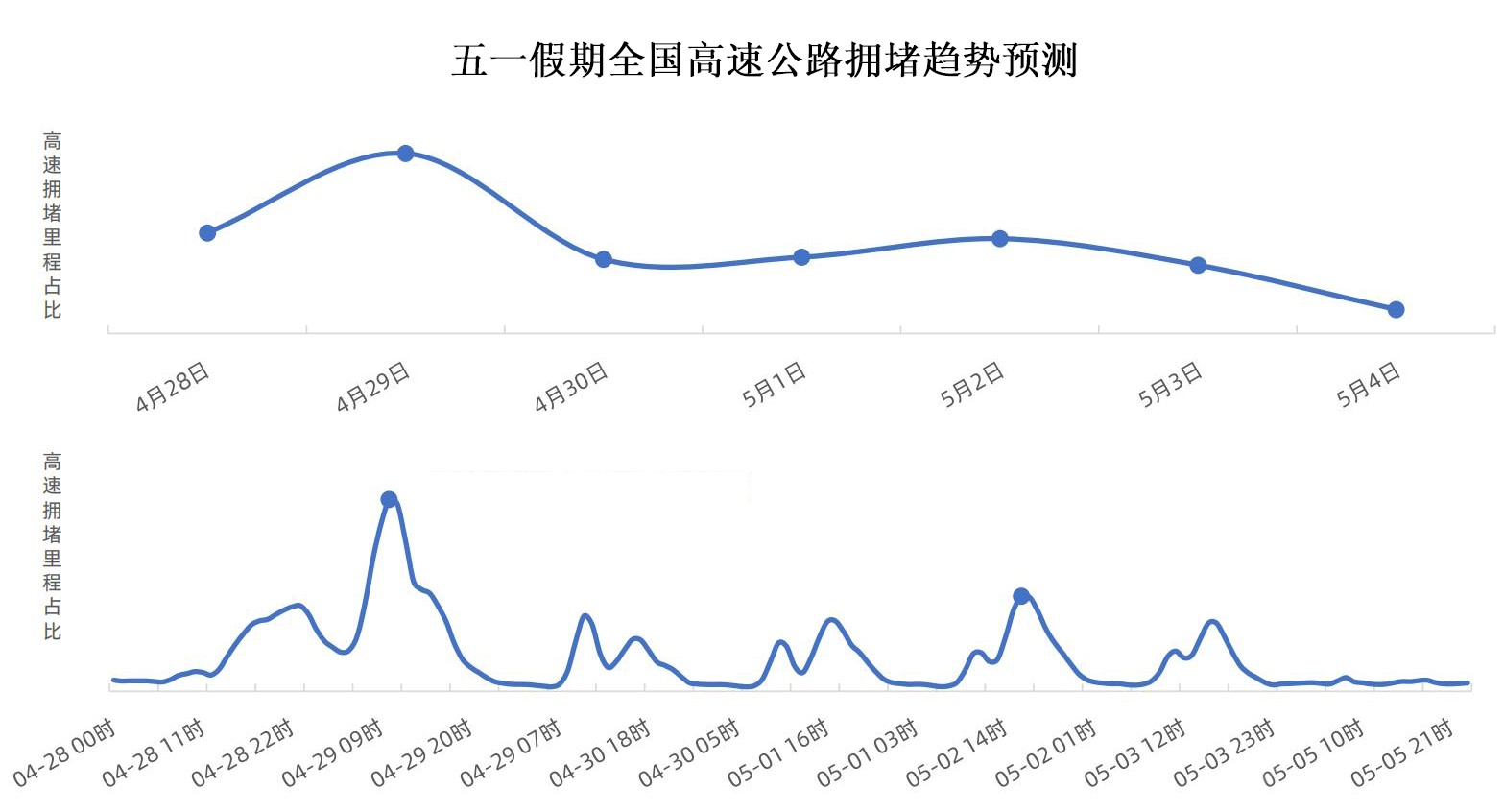 受节前通勤晚高峰及假期前一天出行习惯影响,预计从4月28日14时起车流量将逐渐增长,17时左右出现第一波出程小高峰。假期首日4月29日8时至12时为出程高峰时段,峰值出现在10时-11时,14时至17时可能还会出现间歇性小高峰。5月2日(假期第四天)至5月3日(假期最后一天)为返程高峰,预计出程整体交通压力高于返程,高速返程较为分散。提醒市民合理安排时间,错峰出行。