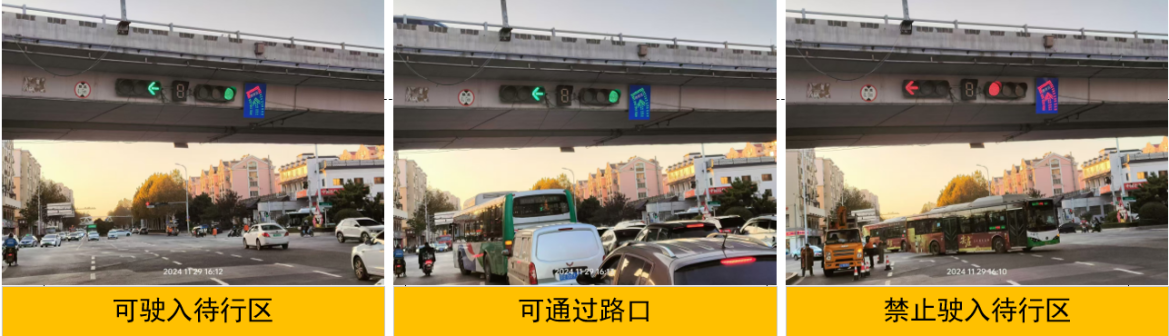 当左转箭头灯和提示屏全部红色时,车辆禁止驶入待行区。