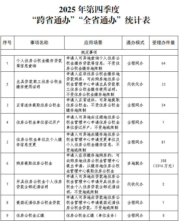 为贯彻上级关于加强数字政府建设、持续优化政务服务的决策部署,市住房公积金管理中心2025年第四季度在住建部规定的13项“跨省通办”事项基础上,继续推动更多事项“跨省通办”“全省通办”,持续提升为民服务水平。现将业务办理情况通报如下。