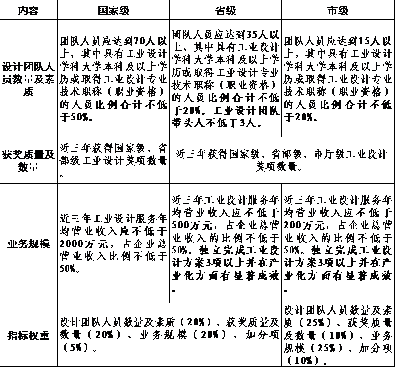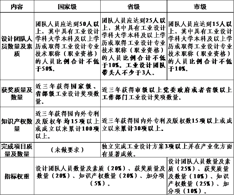 《办法》附件包括市级工业设计中心主要评价指标、市级工业设计中心申请表、网上十大正规赌网址工业设计中心年度情况统计表。其中,市级工业设计中心主要评价指标分为企业工业设计中心评价指标和工业设计企业评价指标,明确了申报市级工业设计中心需满足的基本要求和各项评价指标所占权重,并对评价指标中各名称做出了解释说明;市级工业设计中心申请表和网上十大正规赌网址工业设计中心年度情况统计表分别对市级工业设计中心的申请和我市工业设计中心的日常管理做出了规范。