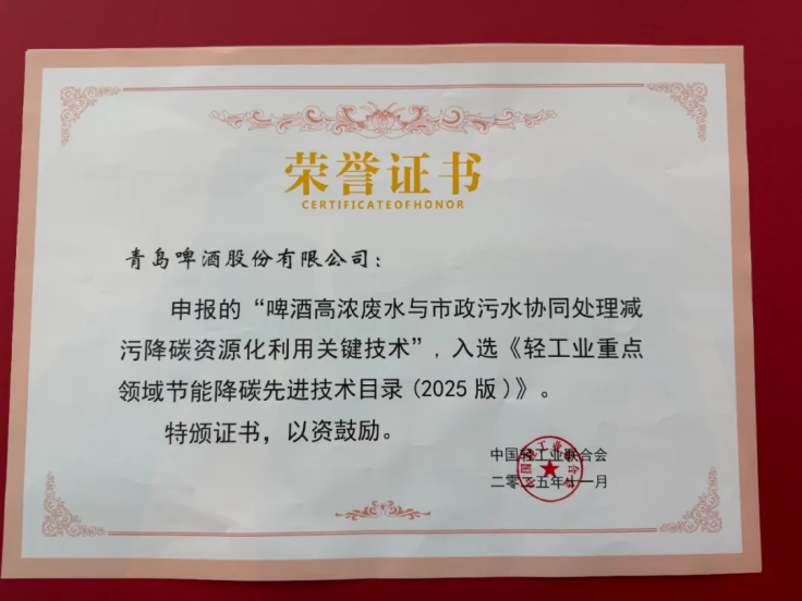 青岛啤酒联合水务集团、青岛理工大学研发的“啤酒高浓废水与市政污水协同处理减污降碳资源化利用关键技术”目前已经在青岛啤酒38家工厂推广使用,因节能减碳效果显著,对上下游协同减污减碳作用较大,对啤酒行业引领示范作用突出,成功入选《轻工业重点领域节能降碳先进技术目录(2025版)》,全国仅18项,啤酒行业唯一。