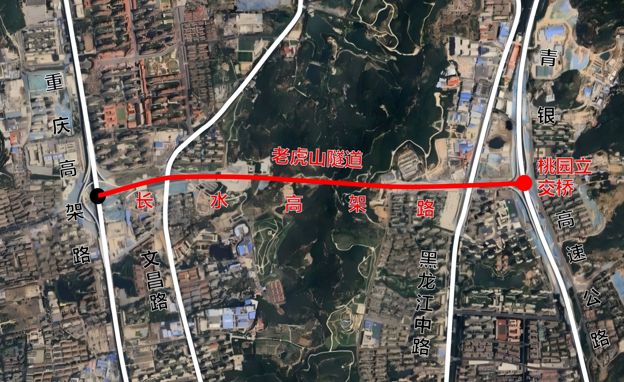 老虎山隧道(Lǎohǔshān Suìdào):东起黑龙江中路西,西止文昌路东,为分离式双洞隧道,长1551米,穿越老虎山。该隧道为长水高架路之穿越山体的通车隧道,为增强交通设施名称的指位指向性,使用该隧道穿越山体名称的方式命名,拟命名为老虎山隧道。