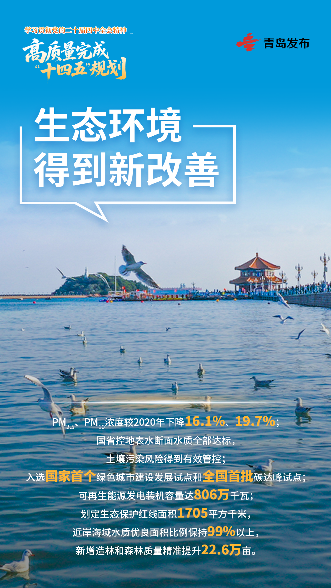 PM2.5、PM10浓度较2020年下降16.1%、19.7%,国省控地表水断面水质全部达标,土壤污染风险得到有效管控,市民切身感受到青岛的天更蓝、水更清、环境更优美。