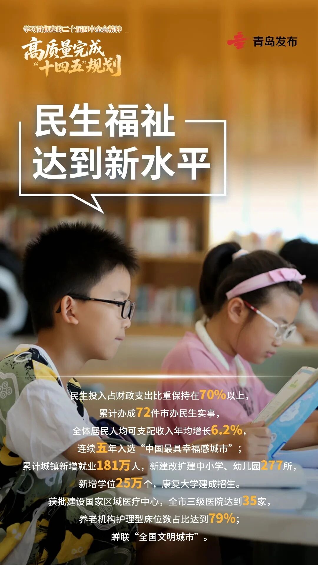 累计城镇新增就业181万人,新建改扩建中小学、幼儿园277所,新增学位25万个,康复大学建成招生。获批建设国家区域医疗中心,全市三级医院达到35家,养老机构护理型床位数占比达到79%,人均预期寿命提高到82.21岁。