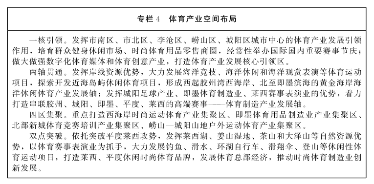 统筹“一核引领、两轴贯通、四区集聚、双点突破”的体育产业发展空间格局,贯通胶州、城阳、即墨、平度、莱西体育制造产业发展轴,建设涵盖健身器械、竞赛用品、运动护具、运动服饰、户外运动休闲用品等产品的生产销售集散地;依托雄厚的体育制造业基础,打造即墨高端体育健身器械制造产业集聚区;引进国际国内知名体育制造企业,发挥其技术和资金优势,支持组建相关产业联盟,锻长板、补短板,集中布局、集约发展,延长上下游产业链,壮大区域性集约发展优势和产业规模。