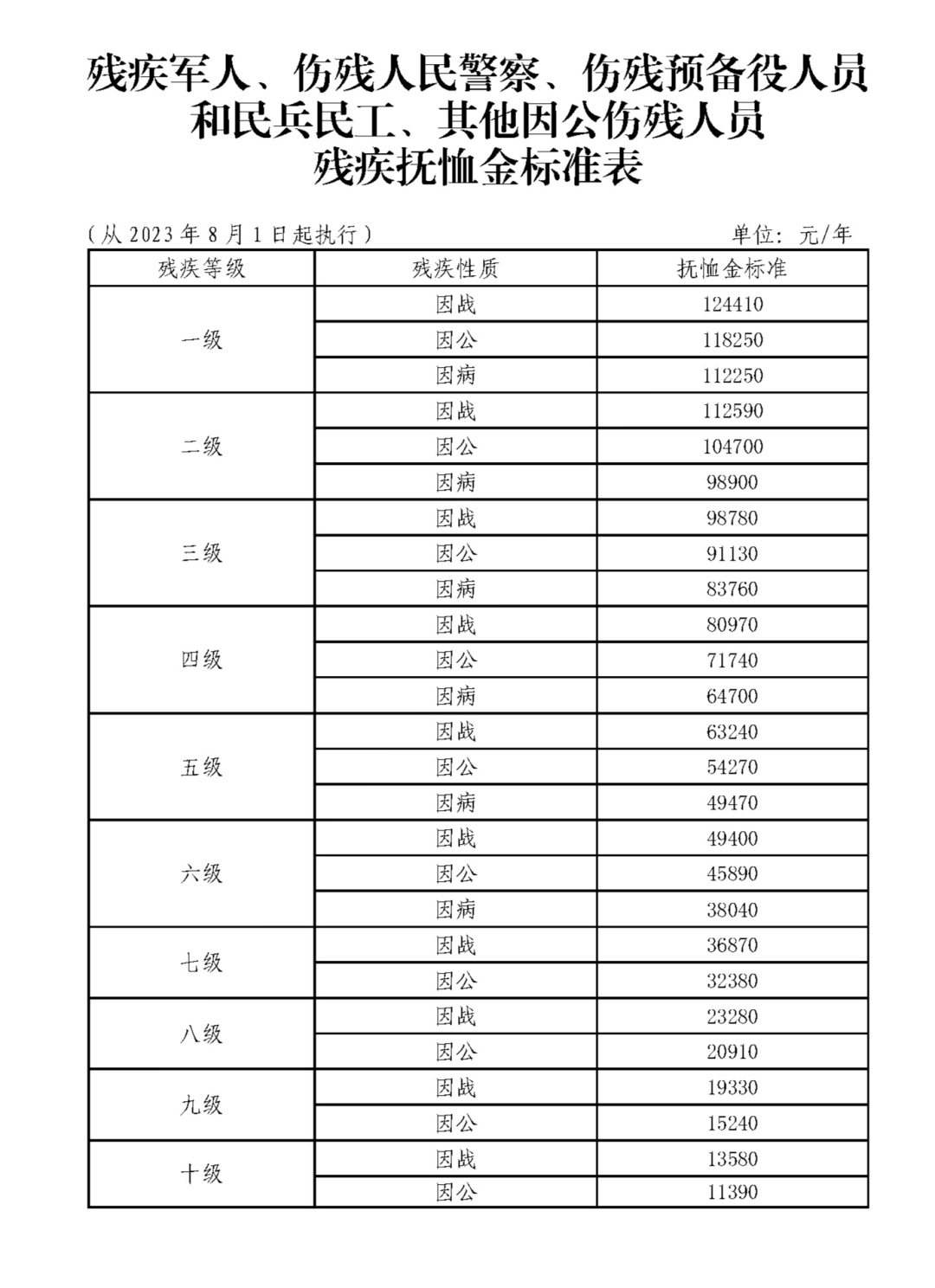 残疾军人(含伤残人民警察、伤残预备役人员和民兵民工、其他因公伤残人员)的残疾抚恤金标准,按照国家、山东省的统一标准落实。