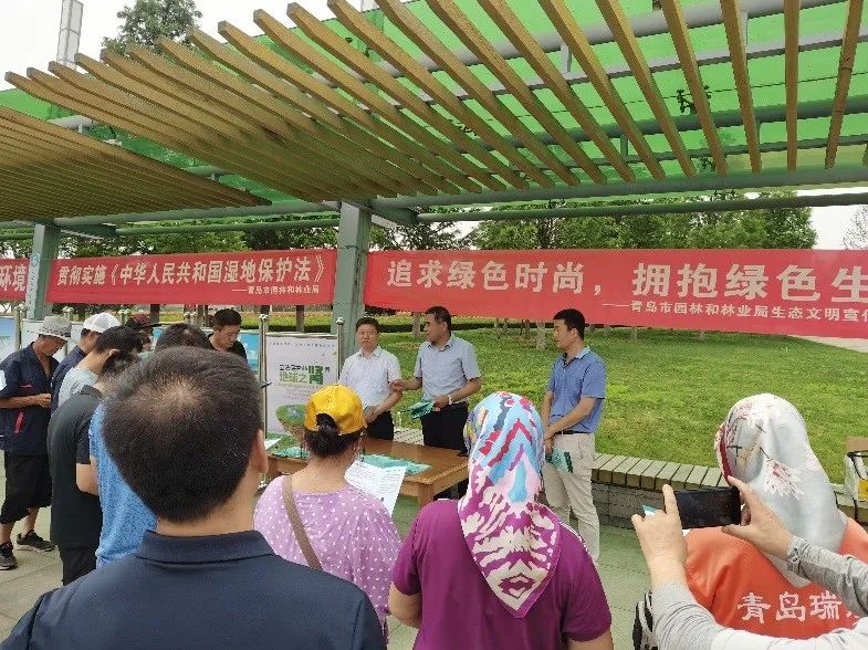 活动现场通过悬挂横幅,摆放宣传展板、现场讲解、派发宣传册,宣传《湿地保护法》相关内容,共发放各类宣传材料500余份。重点讲解《湿地保护法》明文禁止的破坏湿地行为,呼吁广大群众爱护湿地,保护生态环境。青岛日报社掌控传媒对活动进行了全程网络直播,有效扩大了普法宣传的受众面。