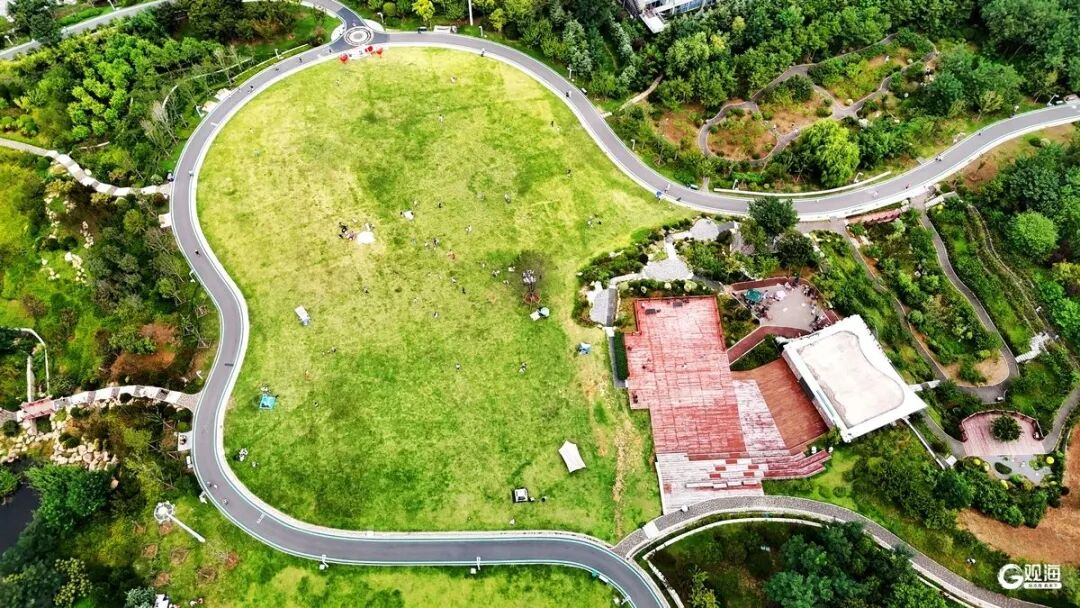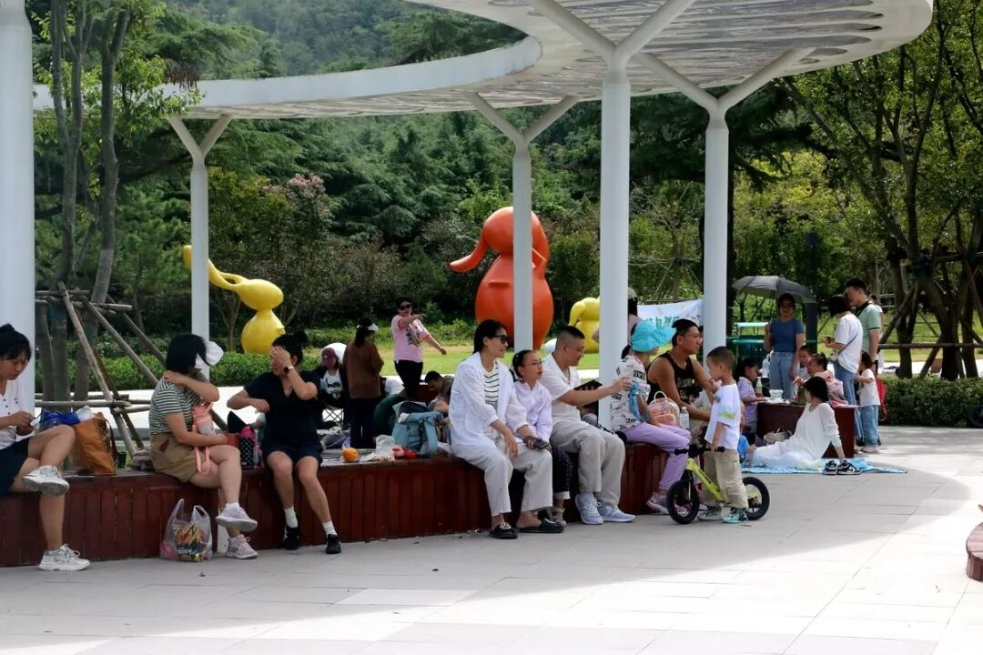 蜿蜒的木栈道依山而建,行人缓步而上,脚下木板轻响,抬头便是层叠绿荫;绿道上,有人骑着单车穿梭,衣角被风掀起,笑声落满林间;草坪空地上,孩子们嬉闹奔跑,几顶帐篷搭在其间,亲朋好友们闲谈畅聊;不远处游乐场里,满是孩子的雀跃呼喊,家长们坐在长椅上,笑着看孩子撒欢。
