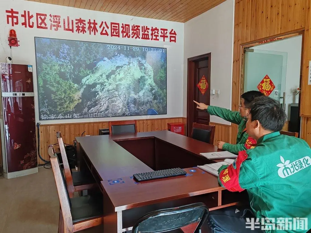 在监控室,值班队员们眼睛紧盯滚动的大屏幕,山上、山顶的监控摄像头基本无死角的对入山人员、火情24小时监测中,特别是热成像探头监测,一旦出现山火会第一时间发警报给值班室,值班人员会第一时间进行处置。在监控室一旁,就是队员们的值班宿舍,床上一块块的“豆腐块”被子格外亮眼。聚泰集团绿化一子公司浮山项目部负责人赵鹏向记者介绍,进入冬季防火季以来,市北区浮山森林公园配备防火巡查人员60余人,严格实行24小时领导带班制度,不间断对绿道、封闭区域进行巡查,全山设置12个防火点位,巡查人员每天进行4遍的点位打卡,做到巡查无死角,安全无隐患。记者从聚泰集团了解到,他们负责北岭山、儿童公园等国有山林7处,协防浮山、双山等集体山林5处,共计240余万平方米,此前已督促落实对防火器材的全面调试和检修工作,对风力灭火机、油锯、割灌机等设备进行了80余台的检修和维护,确保设备能够迅速响应、高效处置火灾险情。