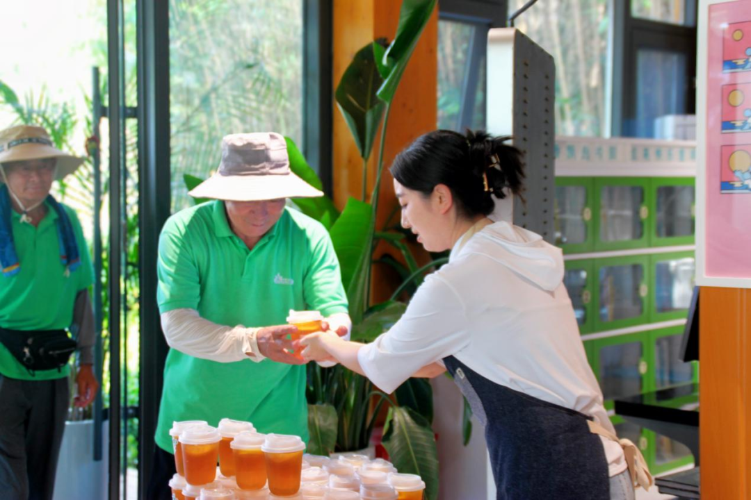 近日,浮山森林公园联合爱心企业开展“一杯冰饮一份情”活动,为养护工人送上冰镇果茶。工人王师傅捧着饮料笑得灿烂:“这杯果茶甜到心里了!虽然天热,但大家惦记着我们,干活更有劲了。”这样的暖心举措,不仅是对劳动者的致敬,更展现了浮山和谐共融的人文环境。
