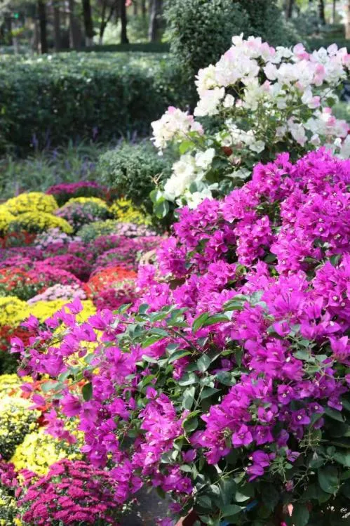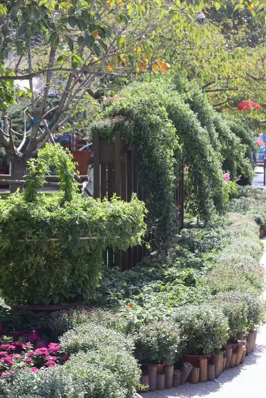 菊韵流霞:南门区域以悬崖菊为主景,红、黄、粉三色花朵如流霞倾泻,搭配造型孔雀、橄榄状菊球等,营造出富有节奏感的入口景观。